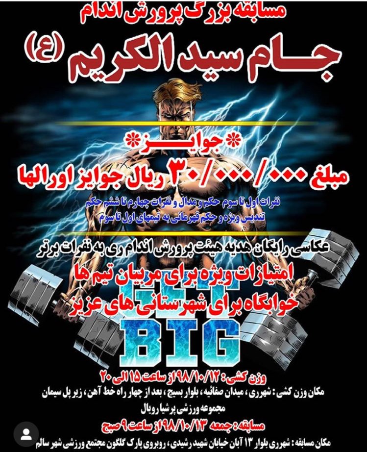 خبرفیت-هیئت پرورشاندام شهرستان ری با همکاری اداره ورزشوجوانان ری قرار است در تاریخ۱۳ دی ماه مسابقات پرورشاندام ری با نام جام سیدالکریم (ع) را برگزار میکند.