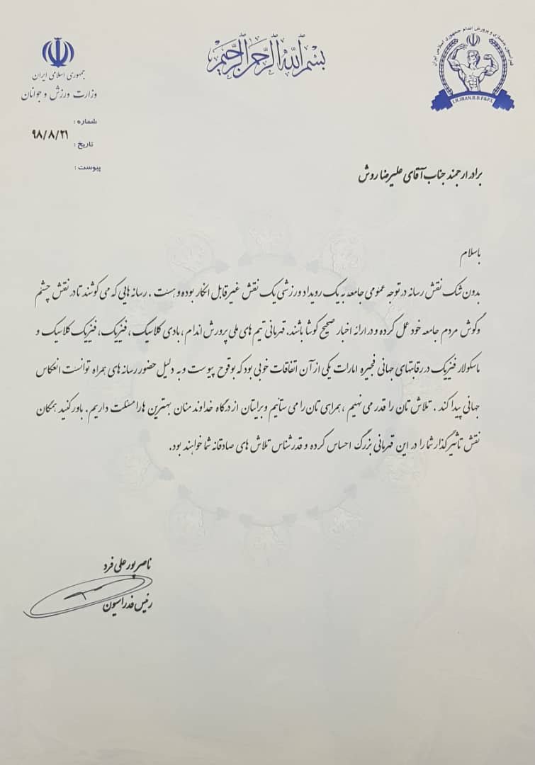 خبرفیت-صبح امروز در محل فدراسیون بدنسازی و پرورش‌اندام جمهوری‌اسلامی ایران از خبرنگاران و عکاسان اعزامی به مسابقات جهانی فجیره تقدیر شد. در این مراسم خودمانی که در دفتر ریاست فدراسیون برگزار شد ،ناصر پورعلیفرد رئیس فدراسیون ،مهدی نصیبی دبیر کل و همچنین محمدرضا نصرالله‌زاده سخنگو و مدیر روابط عمومی فدراسیون بدنسازی و پرورش‌اندام در آن حضور داشتند و از خبرنگارانی که در مسابقات جهانی فجیره به پوشش خبری پرداخته بودند تشکر کردند. رسانه خبرفیت نیز در مسابقات جهانی فجیره با دو نماینده حاضر بود که از سوی فدراسیون از آنها تقدیر به عمل آمد.