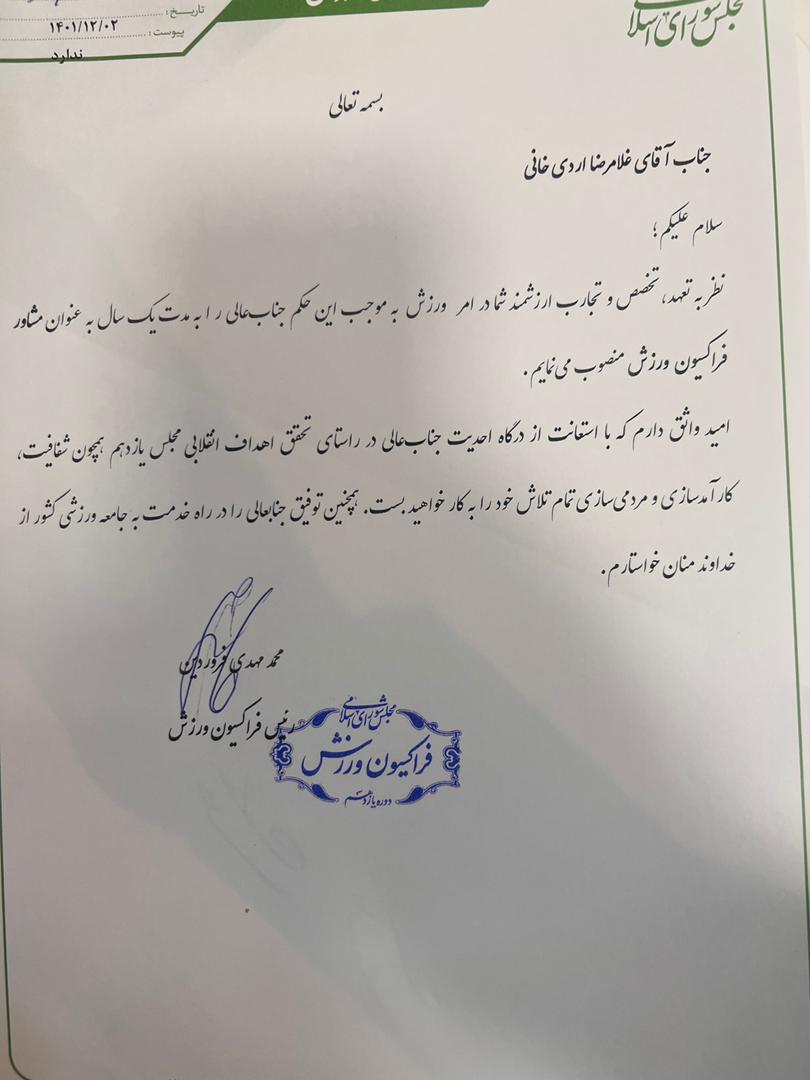 اردیخانی مشاور فراکسیون ورزش مجلس شد